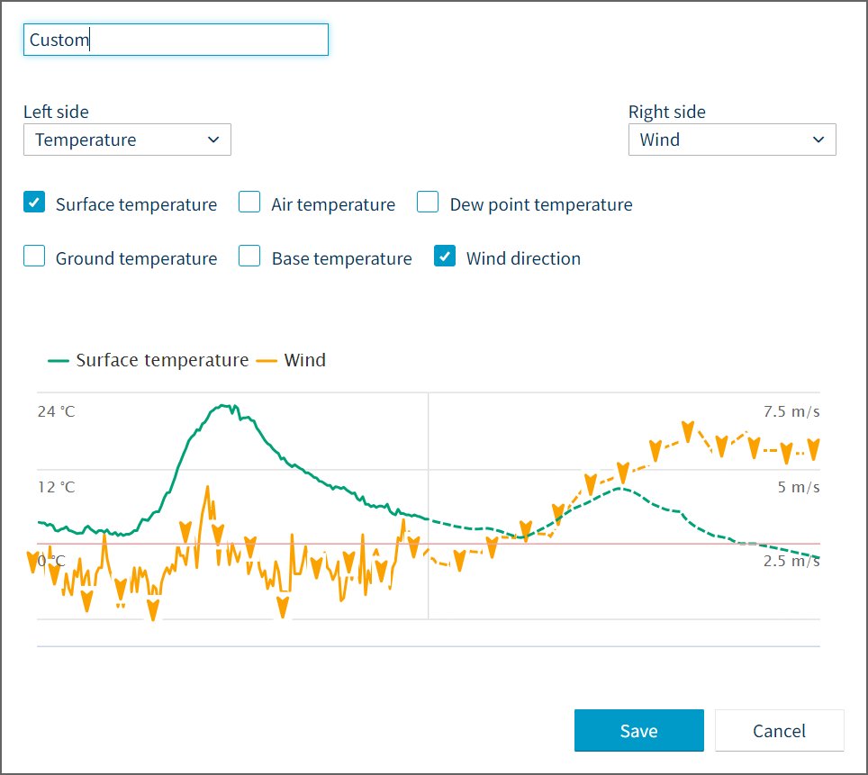 - A maximum of two different categories of data can be visualized at once on the y-axis in the graph. Select the desired categories under Left side and Right side. The category selected under Left side is displayed on the left of the graph, and the category under Right side is displayed on the right of the graph. Select the desired parameters to display using the check-boxes.