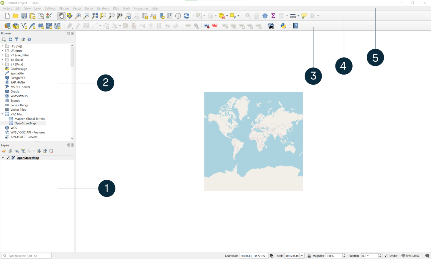 The background map appears in the display window, and is listed in the Layers panel. Re-order the layers by dragging and dropping them in the Layers panel to ensure your network layer is on top.