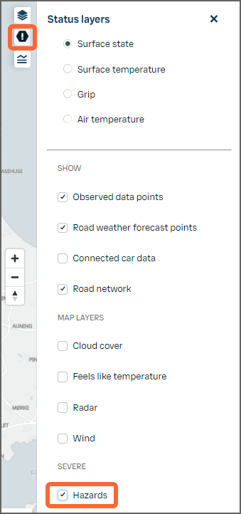 The list only includes hazards for areas visible on the map. Move around the map or use the zoom function to change the location.